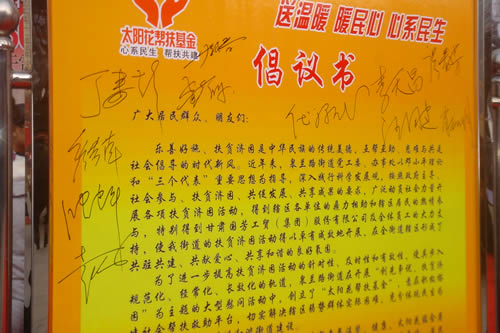 與會(huì)領(lǐng)導(dǎo)分別在太陽(yáng)花幫扶基金倡議書簽名,倡議大家都能有樹立助人為樂、助人為榮的觀念