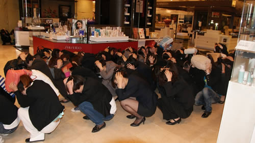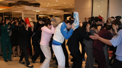 國芳百貨員工按照防震緊急避險的標(biāo)準(zhǔn)動作進行演習(xí)