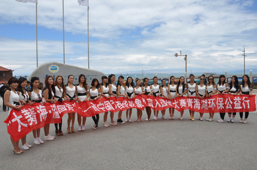 中午,一行到達青海湖畔。天高地闊的美景與靚麗的美女即刻構(gòu)筑成為一道精彩的風景,隨行攝影師、攝像師即刻拿起機器留下許多難得的好畫面。接下來的環(huán)保實踐與環(huán)保意識推廣為眾多選手留下了深刻的印象,許多選手紛紛表示希望通過自己的行動提高社會環(huán)保意識,讓跟多人參與到保護青海湖環(huán)境中來。