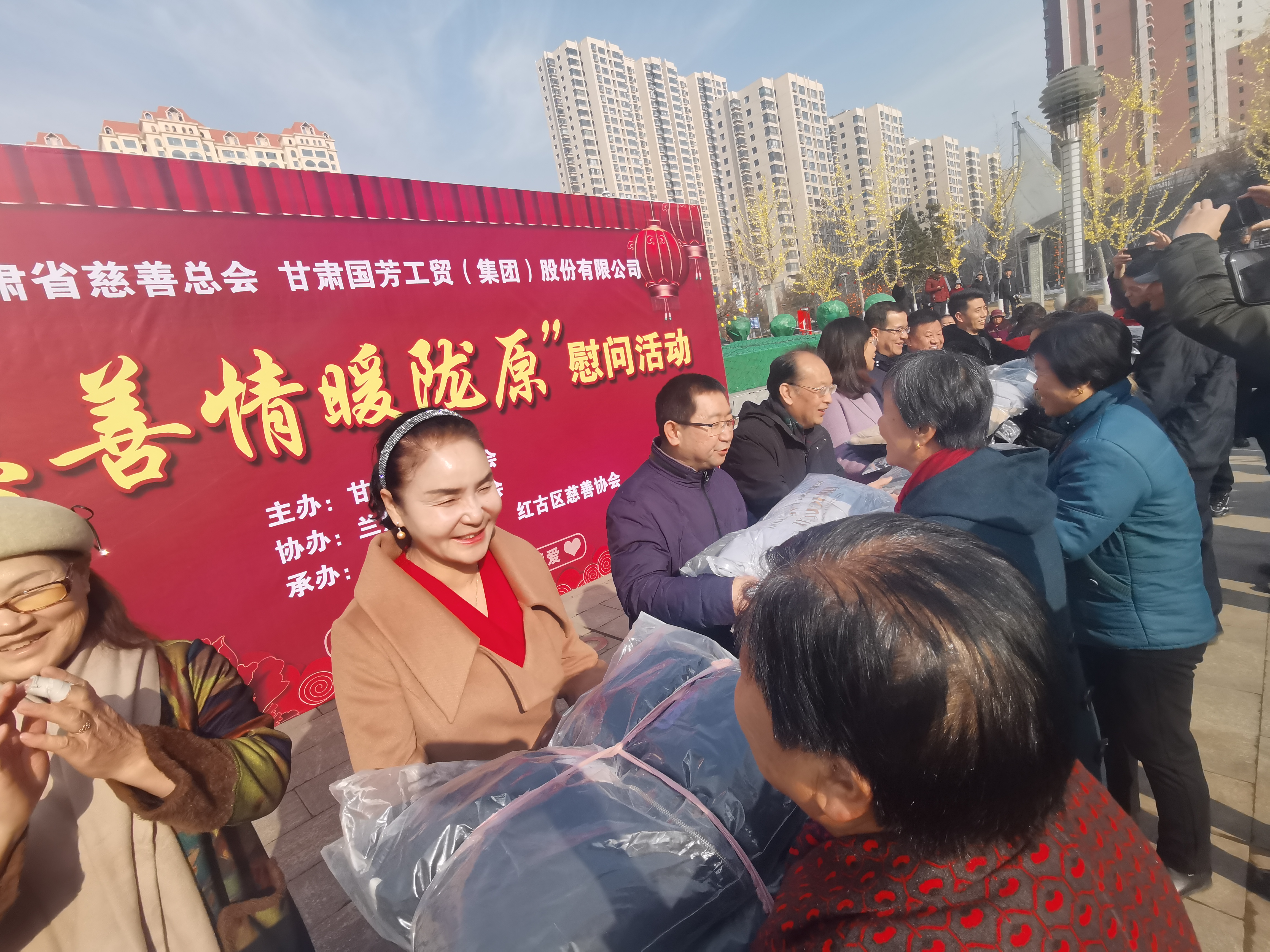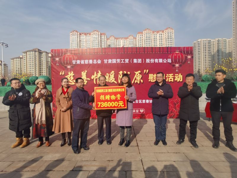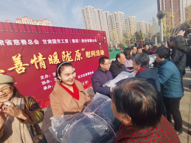 2020年1月14日,甘肅省慈善總會(huì)、蘭州市慈善會(huì)以及紅古區(qū)民政局?jǐn)y甘肅國芳工貿(mào)(集團(tuán))股份有限公司在蘭州市紅古區(qū)海石廣場(chǎng)共同舉行“慈善情暖隴原”暨物資捐贈(zèng)活動(dòng),將2000件棉衣,1200余件秋褲,2000余件保溫杯以及1000余件棉拖合計(jì)價(jià)值73.6萬元的過冬物資帶給蘭州市紅古區(qū)的困難群眾。