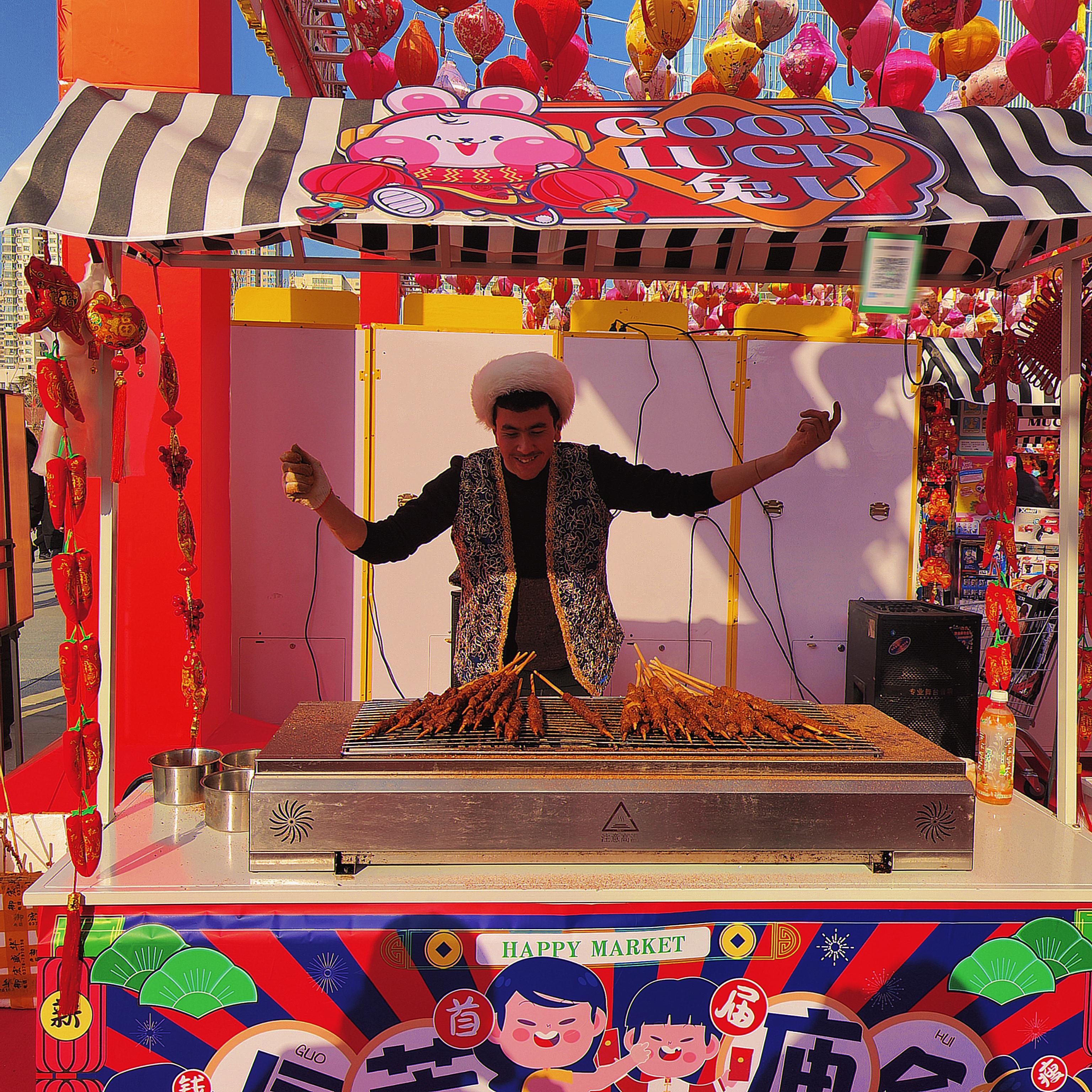 人間煙火處,年味漸濃時。新疆羊肉串、冰糖葫蘆、臭豆腐、酸辣粉、網(wǎng)紅大面筋,蘭州熱冬果……小吃攤生起騰騰熱氣,飄香十里。